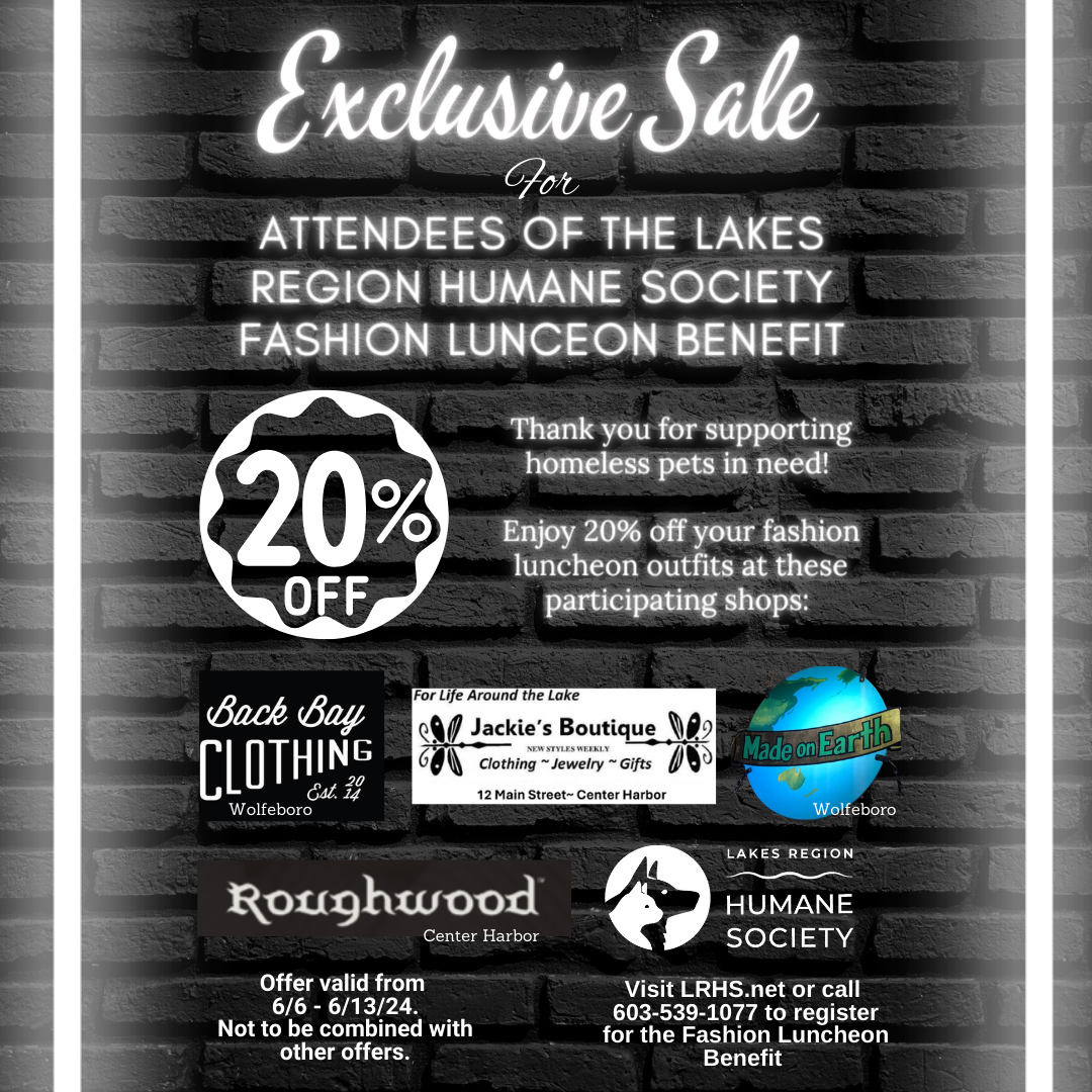 As is tradition, the great “Doggie Challenge”, will be held during lunch. The goal of the “Doggie Challenge” is to raise as much funding as possible to support the ongoing expenses necessary in providing quality care to hundreds of displaced cats and dogs in need annually here at the Lakes Region Humane Society. Donations will be collected during the luncheon and the final tally will be announced following dessert, please come prepared to donate via check, Venmo, LRHS.net or with cash. The “Doggie Challenge” is an exciting way for guests to see how just how quickly donations can accumulate when we work together to reach a common goal.